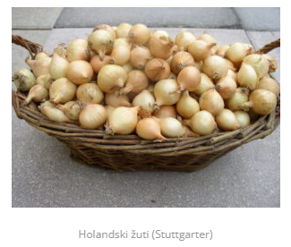 Holandski žuti (Stuttgarter) – najzastupljenija sorta, umjereno ljutog okusa i odlične skladišne sposobnosti.