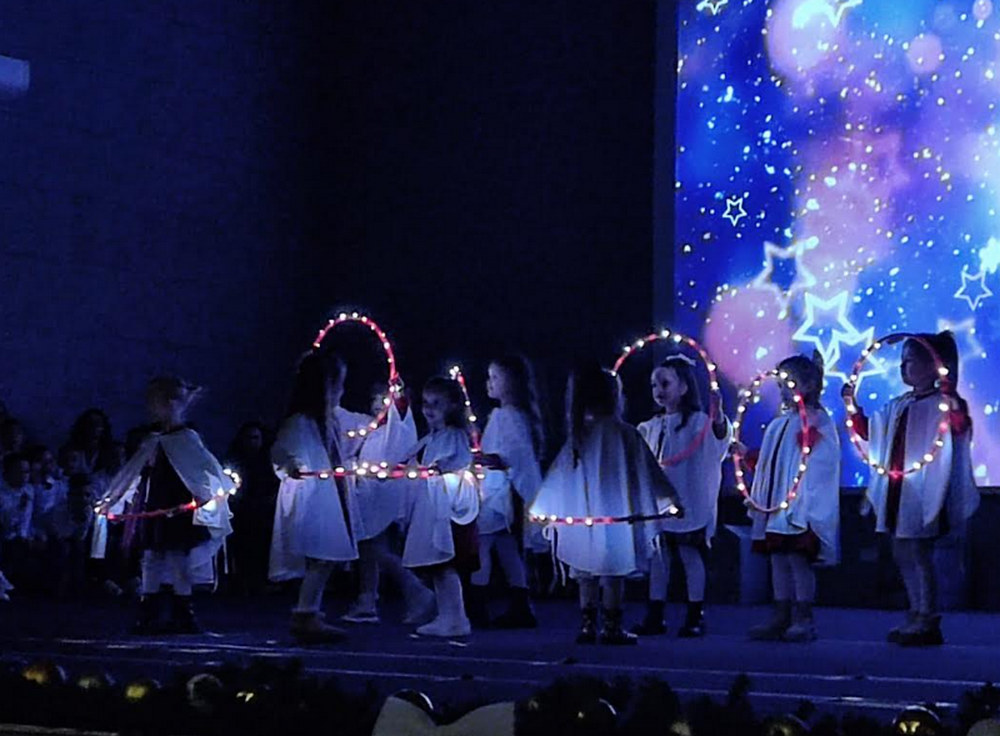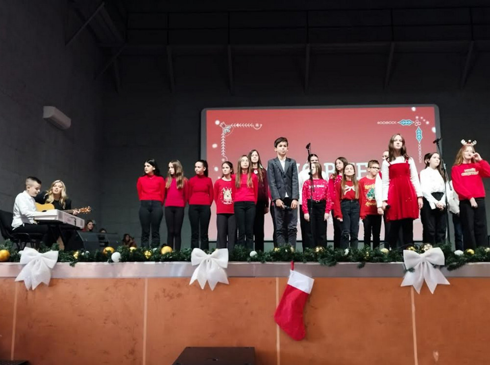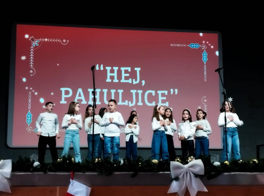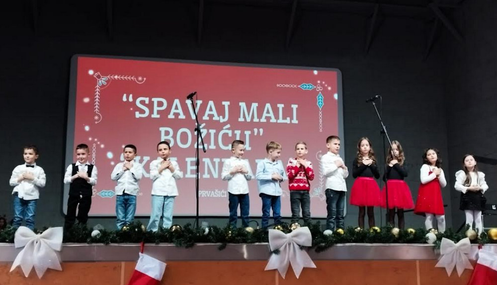 Veliki broj osnovnoškolaca oduševio nas je Božićnim pjesmama, plesom i glazbom a cijeli je program bio osmišljen kao vrlo simpatična priča koju zajedno prate djed i unuka, smješteni pred televizorom u svom dnevnom boravku dočekujući Isusovo rođenje.