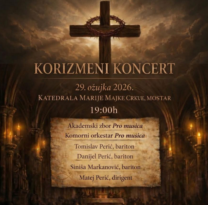 U nedjelju, 29. ožujka 2026. godine s početkom u 19:00 sati, u Katedrali Marije Majke Crkve u Mostaru održat će se svečani Korizmeni koncert, koji donosi večer duhovne glazbe u ozračju korizmenog vremena.
