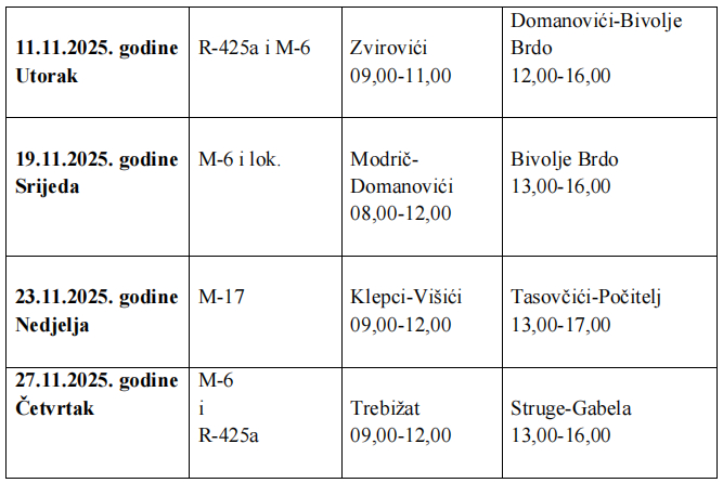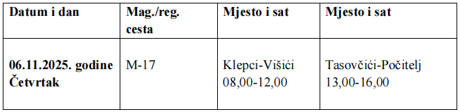 Plan radarskih kontrola Uprave policije MUP-a HNK/Ž za mjesec novembar/studeni 2025. godine: