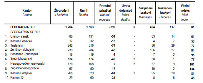 To su Zapadno-hercegovačka županija i Hercegovačko-neretvanska županija, a jedna županija u Federaciji bilježi vitalni indeks ispod 50 što je posebno zabrinjavajuće.