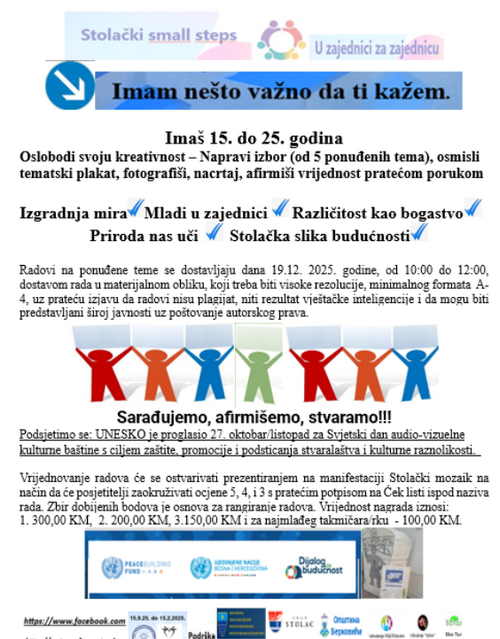 Prepoznavajući kreativno izražavanje kao snažan alat za afirmaciju društvenih vrijednosti, Udruženje za podršku, edukaciju i razvoj „TRANSFORMATOR“, u partnerstvu s udruženjem „Susreti“ , u okviru projekta „Stolački Small Steps – u zajednici, za zajednicu“ poziva mlade osobe od 15. do 25. godina da se osnaže i postanu kreatori plakata na ponuđene teme.